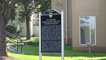 A historical marker for the railroad was erected as the result off a Leadership Sarpy project at Sump Library. It is shown above near where the first track was laid.